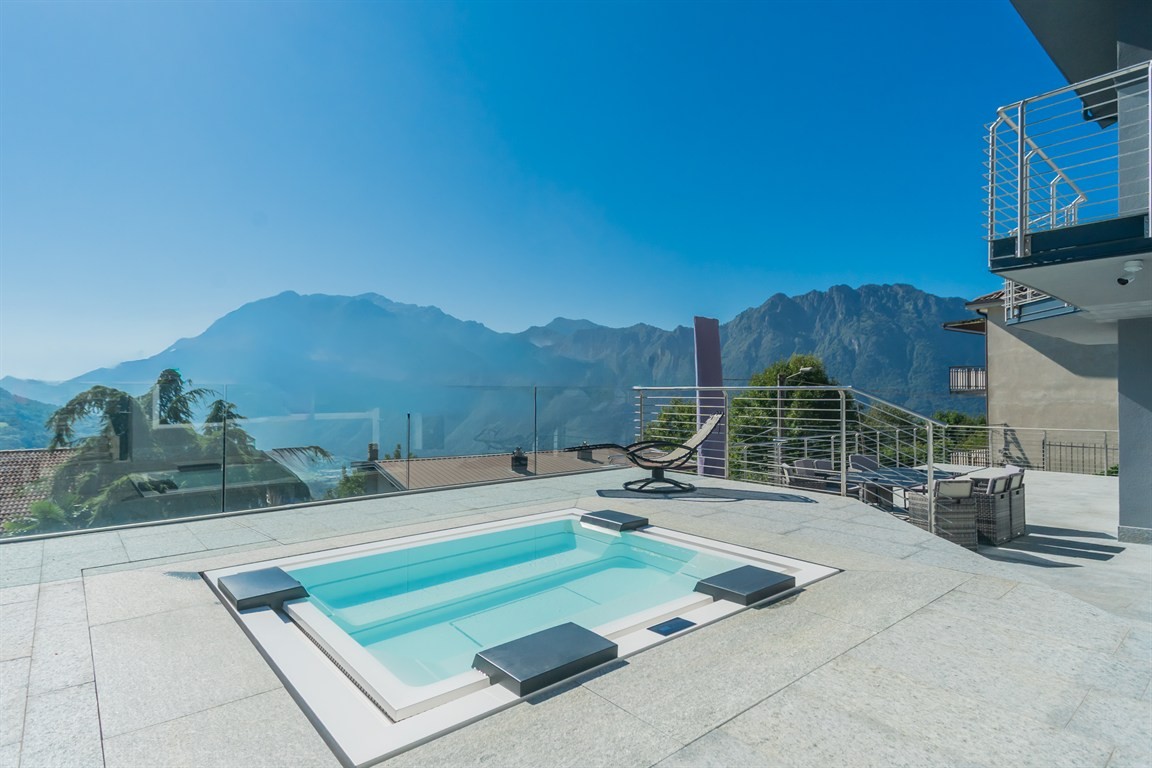 Sistema domotico con comando vocale per gestione luci, clima, intrattenimento, Jacuzzi ed elettrodomestici, video citofono smart con display su ogni livello e accesso remoto tramite App.
