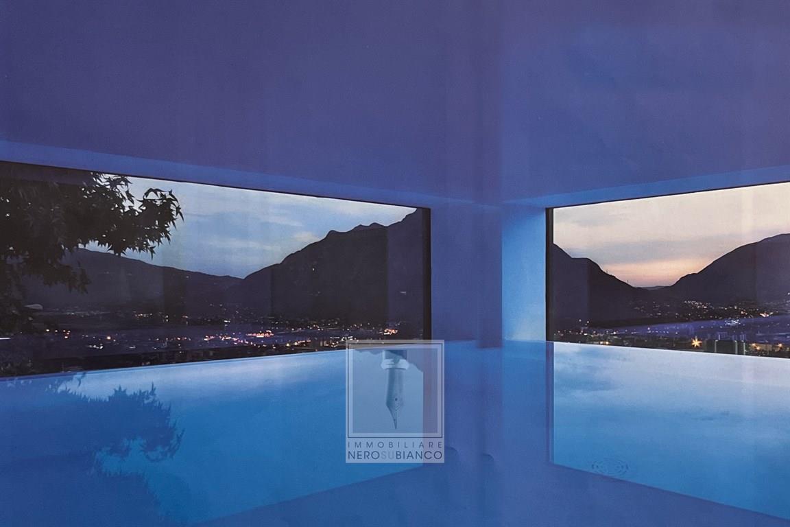 Sempre sullo stesso piano troviamo la piscina interrata aperta con due vetrate orizzontali verso il lago sottostante, che più che vasca natatoria si propone come attrezzatura termale fornita di idromassaggio, di una chaise-longue sommersa, uno spazio living con annesso camino ed un piccolo solarium esterno pavimentato in teak per esterni.